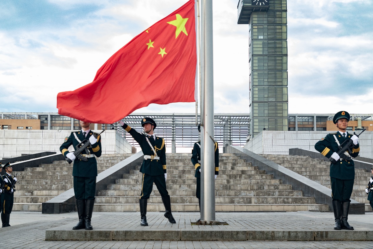 清晨7:15,國旗護衛隊的同學們邁著鏗鏘有力的步伐,步入禮儀廣場升旗區,伴隨《義勇軍進行曲》,全體師生莊嚴肅立,五星紅旗冉冉升起。