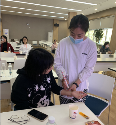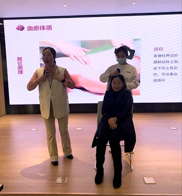 表彰結束后,由西安中醫腦病醫院治未病科主任余亞蘭主任醫師為大家帶來題為《中醫藥里的女性養生》的女性養生保健科普講座。大家根據現場發放的《中醫體質辨識分類評定表》進行體質類別自初測,根據自測結果帶著疑問聆聽講座。余主任從九種體質特點及養生、乳腺病的自我檢查方法、面部美容穴位按摩、艾灸的正確使用、頸椎操、養生藥茶推薦等6個專題為大家進行了專業講授和現場指導。女職工們爭先恐后上臺進行互動,會場氣氛非常活躍。